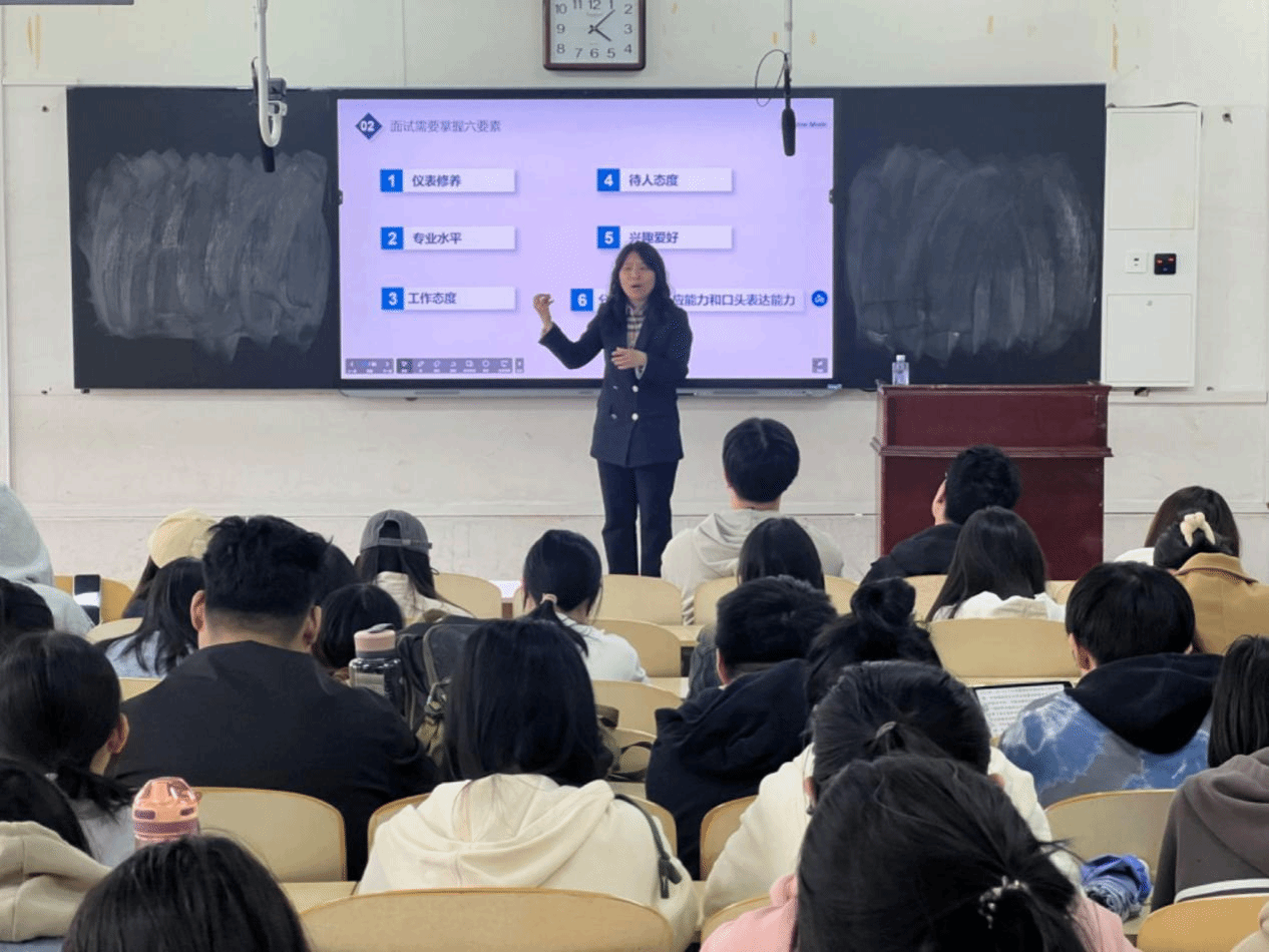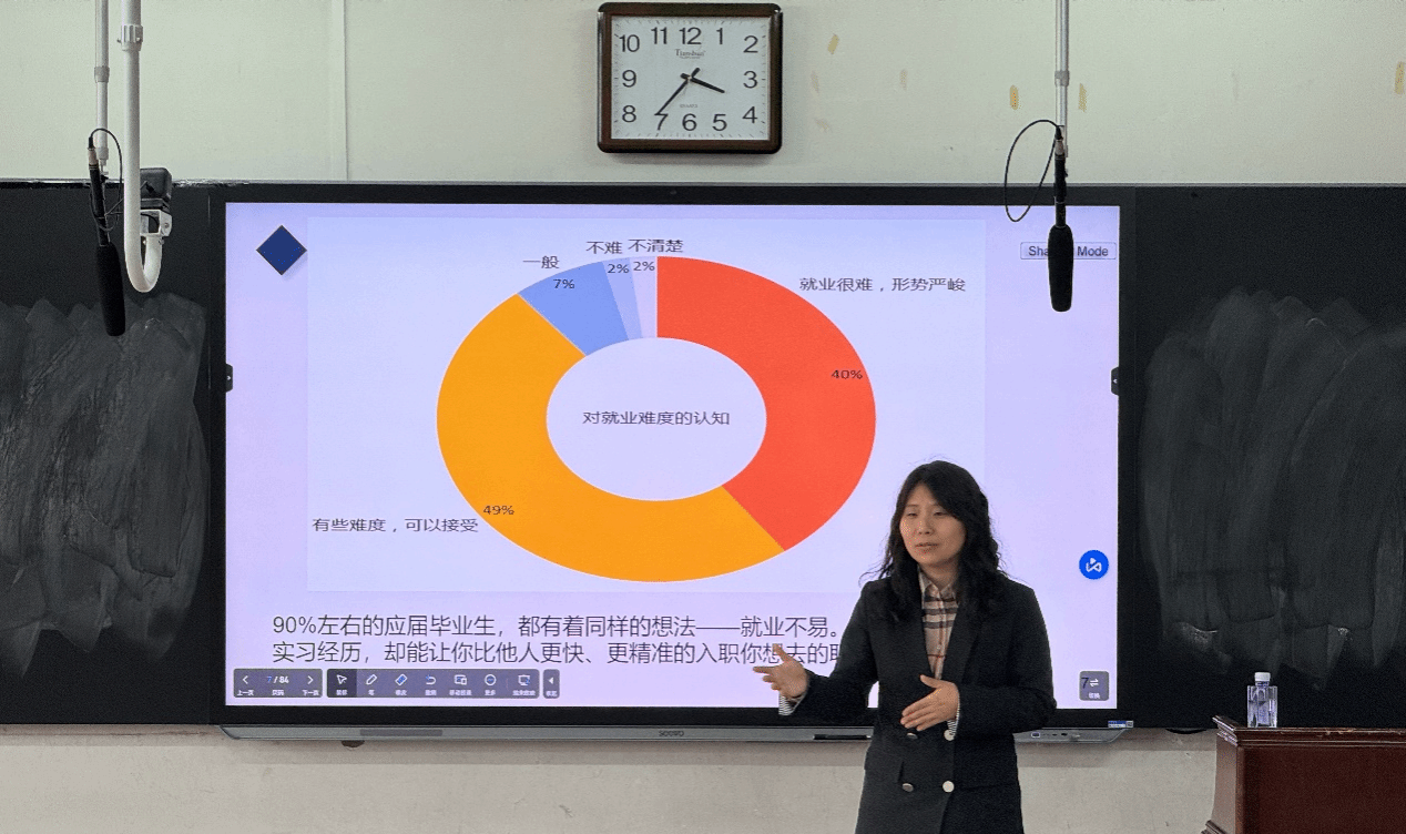 此外,她还对当前毕业生就业形势进行了分析,面对竞争激烈的就业形势,大学生要理性看待市场现状,根据自身情况做出合理的职业规划,及时评估与调整,并积极提升个人竞争力以应对激烈的就业竞争。同时,也要关注新兴行业和领域的发展动态,把握更多的就业机会。