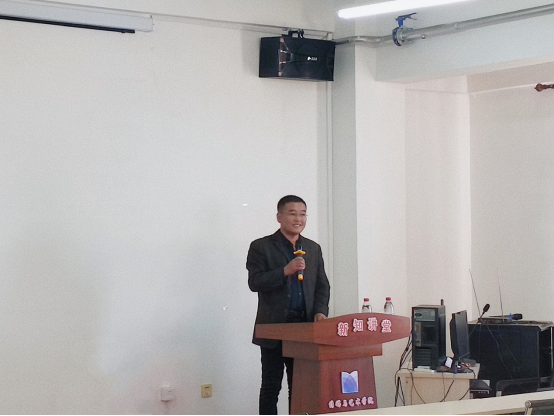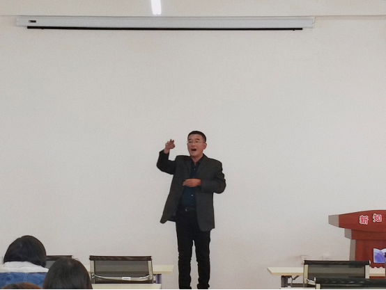“热爱是最好的老师”老师介绍到自己上学时就喜欢朗诵播音,在大学期间学习英语师范专业,拥有5年的从教经历,因为对新闻的热爱1997年考入阜新电视台,从事播音行业。随后,他给现场的同学讲述了播音员的特殊性和专业性,示范了发音的技巧,从咬字系统、动力系统、美化共鸣、发音器官的保护四个角度给大家解析了播音技巧。