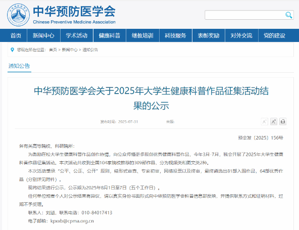 大学生健康传播科普作品征集活动由中华预防医学会联合中国疾病预防控制中心开展,2025年的活动主要包括体重管理、运动安全与健康以及科学预防肺炎三个主题,分为视频类和图文类2种传播形式。活动吸引了复旦大学、浙江大学、东南大学、华中科技大学、广州医科大学等全国104家院校参与。经形式审查、专家初审,网络投票以及终审,最终遴选出64部优秀作品,81部入围作品。