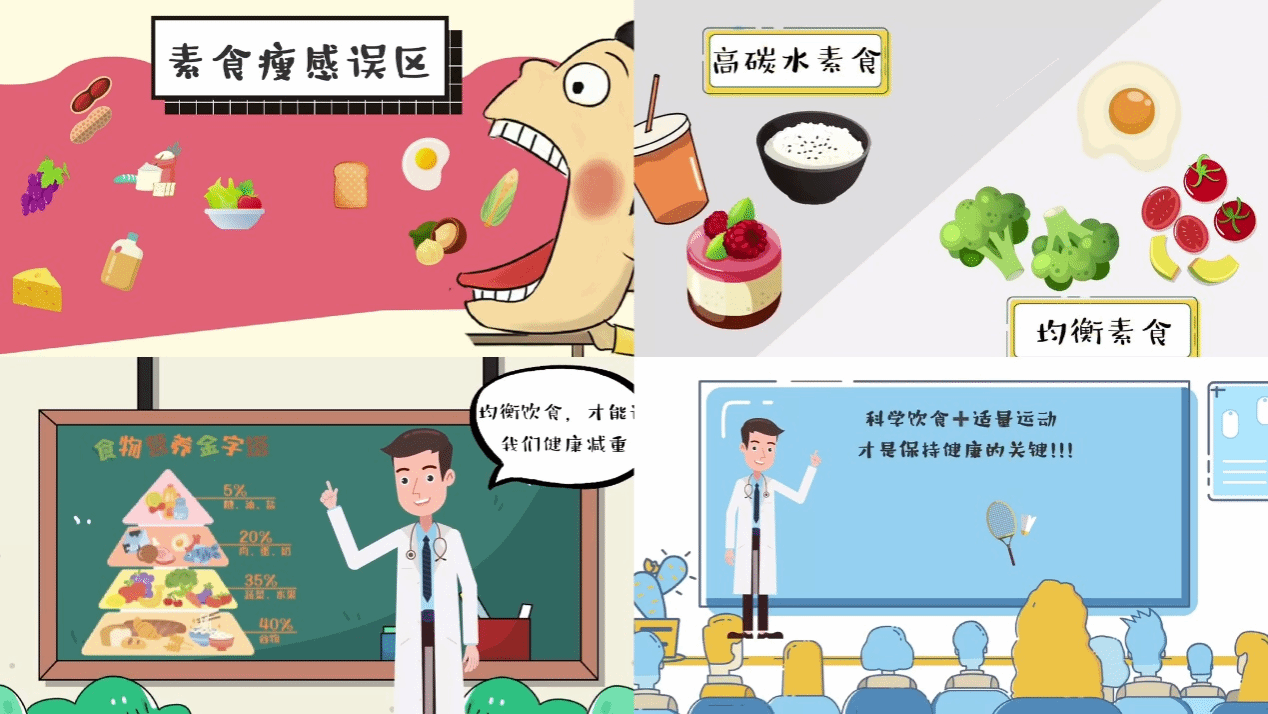 22级崔欣、韩月怡、陈琦莹三位同学制作的《素食瘦感误区》,是一部以“打破素食瘦感误区”为主题的动画短片,用轻松欢快的动画形式向观众传递只吃素并非能够科学减重的观念。短片从大部分人认为素食等于低热量这一错误观念出发,阐述长期只食用素食体重不降反升的结果,过渡到要合理利用食物营养金字塔,均衡饮食再搭配上适量运动,从而达到健康减重的效果。画风清新色彩丰富,文字简明扼要,首尾呼应点明主题,更好的为大家科普素食瘦感这一减肥误区,提出健康合理饮食才是减肥正道。