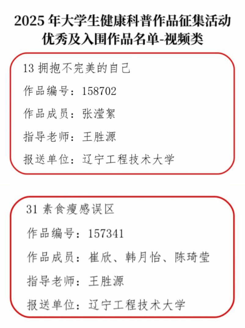 日前,中华预防医学会发布2025年大学生健康科普作品征集活动的结果公示,我院王胜源老师指导的作品《拥抱不完美的自己》(团队成员:张滢絮,郑燕华,张子涵,张宛彤)、《素食瘦感误区》(团队成员:崔欣,韩月怡,陈琦莹)荣获视频类入围作品奖。