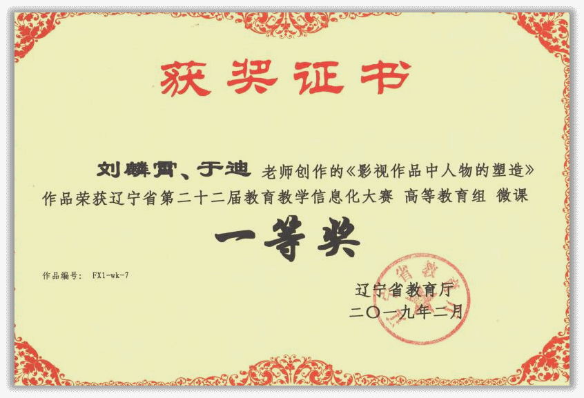 《影视中的人物塑造》微课作品在辽宁省第二十二届教育教学信息化大赛中荣获省级一等奖,并在全国教育教学信息化大赛高等教育组国赛中获得三等奖,体现了课程在教学资源开发与教学设计上的良好成效。课程指导学生在各类竞赛中表现优异,累计获国家级及省级奖项30余项,充分展现了课程在人才培养方面的显著成效。