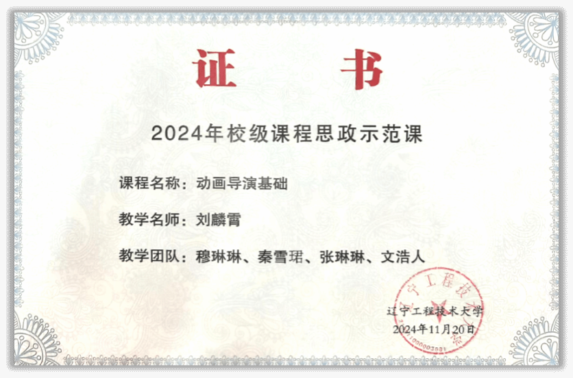 《动画导演基础》不仅成功获批校级思政示范课,还在2025年入选校级AI赋能课程建设培育项目,体现了课程在思政融合与技术创新方面的积极探索。其综合训练项目获评校级优秀训练项目,反映出课程实践教学的扎实成效与良好示范作用。